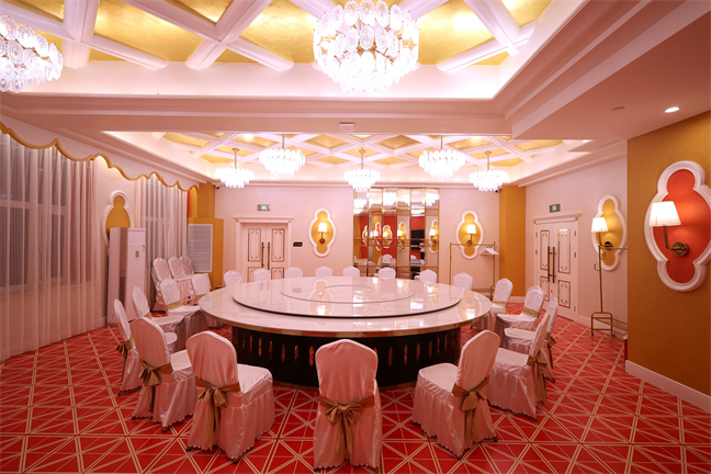 皇宮廳—金碧輝煌、皇宮式裝修,面積1038㎡,層高8.6米,配備愛情階梯、軌道威亞、二層觀禮臺、浪漫燈光秀、旋轉(zhuǎn)升降舞臺、頭頂天幕連接開合大屏??沙薪?0桌的大型宴會,也可舉辦600人的大型會議;還可用作會展、車展場地,每逢節(jié)假日還為市民上演文藝節(jié)目。